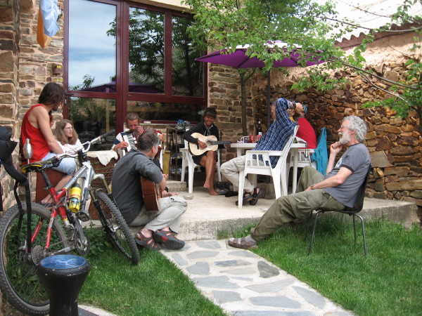 May 6, 2014 Walked to the small village of El Ganso. Had a great time at Albergue Gabino with a number of pilgrim musicians. There were accordian players, guitars, drums, and other percussion instruments. Mary made a pasta dinner for everyone.