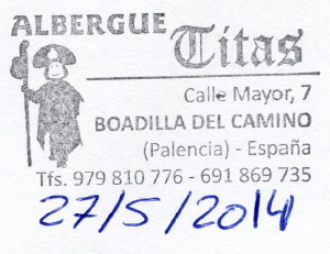 May 27, 2014 Walked to Fromista. Visited church sites. Then onto Boadilla del Camino. Stayed at new albergue, very pleasant. Others were an American from Colorado and two German women.