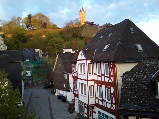 May 1, 2015 A foggy morning. I walked the short distance to Dillenburg. Had breakfast and then checked into the Hotel Dillenburg. Since it was May day, it was a holiday. There was a band and food on the street just outside the hotel. A very nice time.
