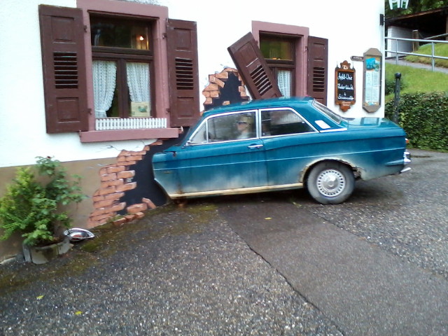 May 15, 2015 In the morning there was occasional rain. At Waldhaus, I was able to have breakfast. Visited with a couple staying there. The owners liked cars, especially older American cars. They had a car built into the wall of the house, outside of the dining area.