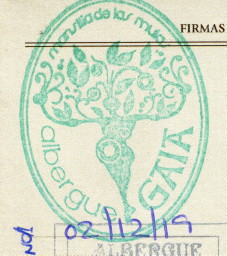 December 2, 2019 After big coffee con leche started walking before 8 PM. Was a blue sky and sun for once. Stopped at Releigos and had coffee with 4 other pilgrims. Walked with them to hostel in Mansilla de las Mules. The hostel almost filled up. The Italian and his dog were there too. Had dinner there as did most everyone.