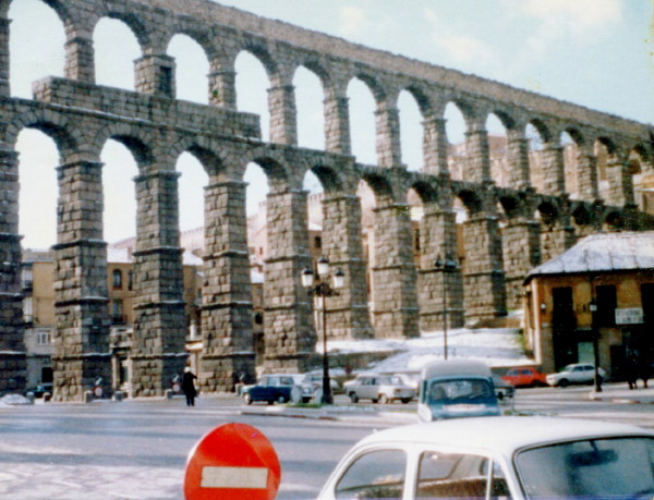 In the morning Australians Julie and Jenny and myself decided to take a day trip to Segovia. We were told that we could not stay at the Madrid hostel any longer because a large group was coming that night. We left our baggage at the hostel and took the 11:15 AM train over the mountains north of Madrid to Segovia. The train was stranded for an hour in the mountains due to engine trouble and a snowstorm. We finally arrived in Segovia at 2:30 PM. Cold and starving, we bought bread and cheese at a shop then went to a caf restaurant for coffee. After getting the coffee we sat down and began to eat the bread and cheese. The manager initially objected, but eventually he relented and said it was OK.