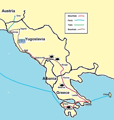 For the entire 75 mile ride to Olympia, Greeks would wave at me and say hello. School kids exercizing in schoolyards would stop and wave and cheer. I arrived in Olympia at 3:15 PM and checked in at the youth hostel. 2 other Americans from the boat to Patras had taken the 11 AM train and arrived the same time as I. They were surprised to see me. I met a German biking from the opposite direction (Athens).