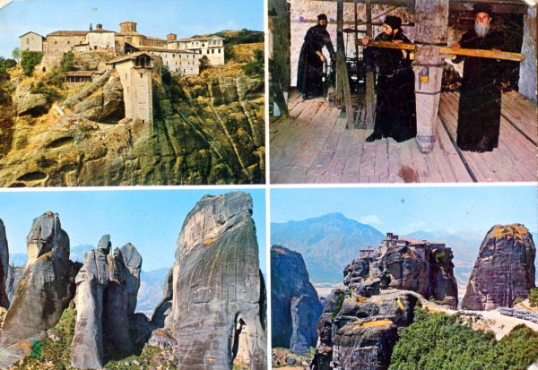 Apr 16, 1979 Although the morning was a little hazy, I hiked to the Meteora monasteries. They were built atop the rocks to protect the monks from their enemies. At the first monastery I was not allowed in as my hair was too long. Woman with slacks also were not allowed in. Some Americans (working in Greece) gave me a ride to the other monasteries that were open that day. I had no problem getting in and found them interesting, well kept, and catered to tourists. Most tourists were Germans traveling in modern buses.
