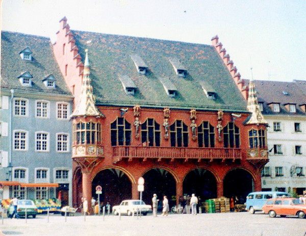 May 31, 1979 From the hostel, I walked to downtown Freiberg, bought a map of the Black Forest hiking trails and looked over the city. The main cathedral had large, fine stained glass windows. The market outside the cathedral sold long bockwurst. Many street corners had drinking spouts of clean, cold, free running water. In the evening had some beers with Aussies and Chinese Americans.