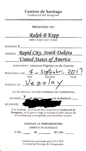 To be able to stay at the pilgrim refuge's or gite's, a pilgrim passport or credencial is presented to the lodging manager. The lodging manager stamps the credencial with their unique stamp. See below for partial view of my french credencial.