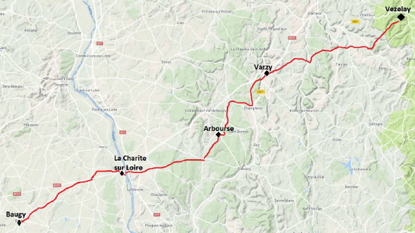 September 7, 2017 I walked with Guilhem to La Charite Sur Loire, 20 km (80 km total). We walked on roads much of the way and saw many vineyards. Guilhem checked into a hotel near downtown and I visited the tourist office and they gave me the keys to the municipal gite. Later Quentin and Aurelia showed up. They were concerned about selecting a bed, being careful not to position their head pointing north. I got out my compass to help them make the right choice.