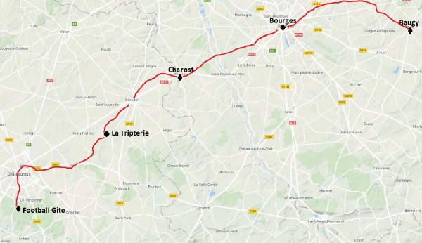 September 9, 2017 Walked with Guilhem to Bourges. Much of the 32 km (142 km total) was on the road, tiring on the legs. It was a pleasant day and we passed thru the villages of Villabon, Brecy and St Solange. The last several kilometers were on an old roman road. We could see the tall Bourges cathedral from a long distance. In Bourges I found the B&B, La Paradis, located downtown in a 2nd floor apartment.
