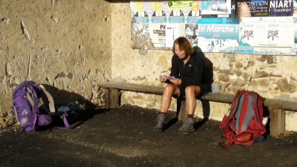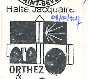 Later, we stopped for lunch in Sault de Navailles. A couple of young girls on skateboards entertained us. After 27 km (830 km total) we reached Orthez at 4PM. The refuge, Hotel de la Lune, was open and Willie was already there. It was a centuries old stone tower. We cooked dinner in the refuge kitchen.