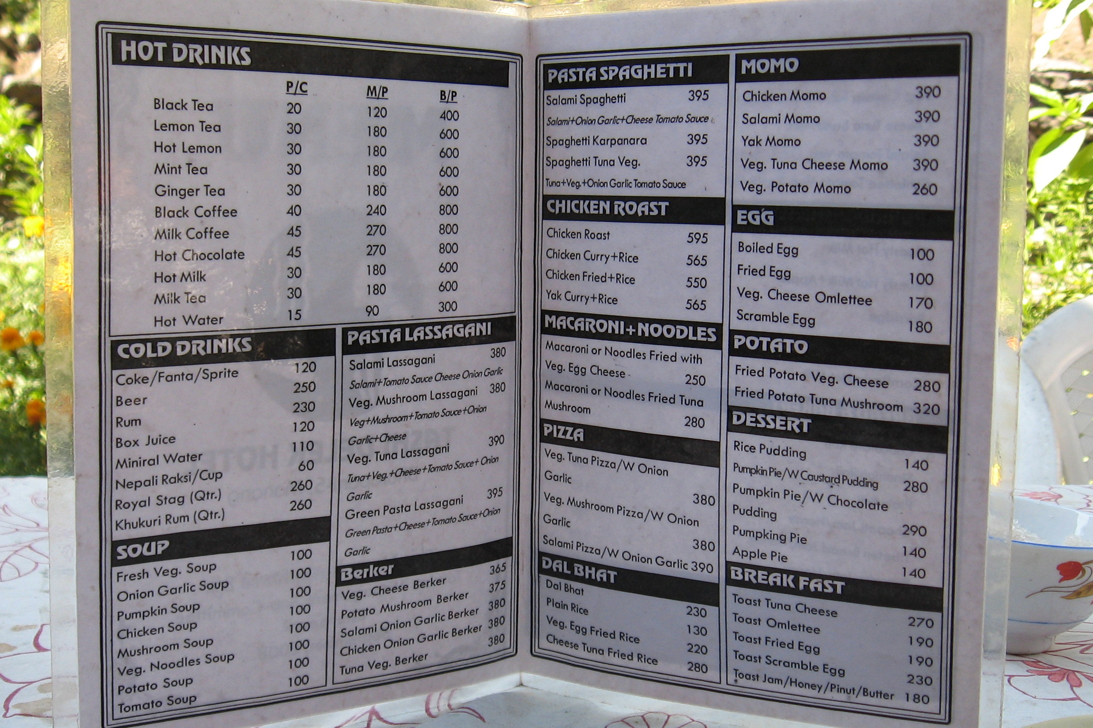 The prices in Nepali rupees (75 rupees per US dollar) varied from place to place. This menu is one of the more expensive. Most menus featured a wide range of vegetarian meals. If there were meat dishes, the amounts of meat were usually small. I, as most trekkers, walked 5 or 6 hours a day and burned up many calories. So it was important to eat a lot. At higher altitudes I lost my appetite, and consequently would lose weight while on a trek.