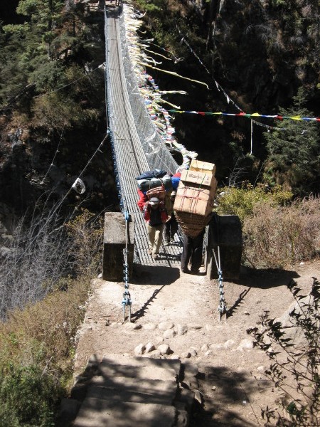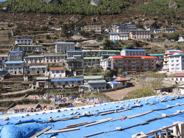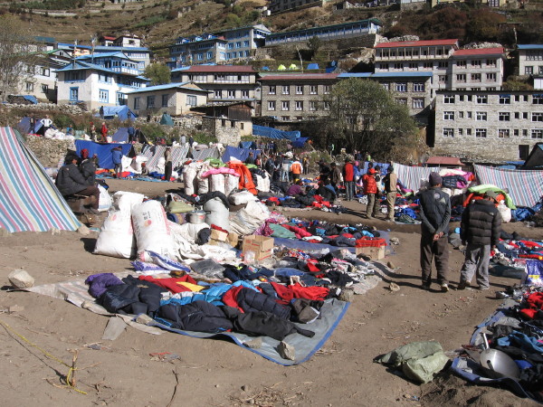 The last 2 hours to Namche Bazaar were up a steep trail. At Namche, I checked into the Buddha lodge. Across the hall from me were the Germans, Annett & Lutz. They reminded me that today was the weekly market in Namche. The market was rather spread out and had mostly goods for Nepalis and not too much for tourists.