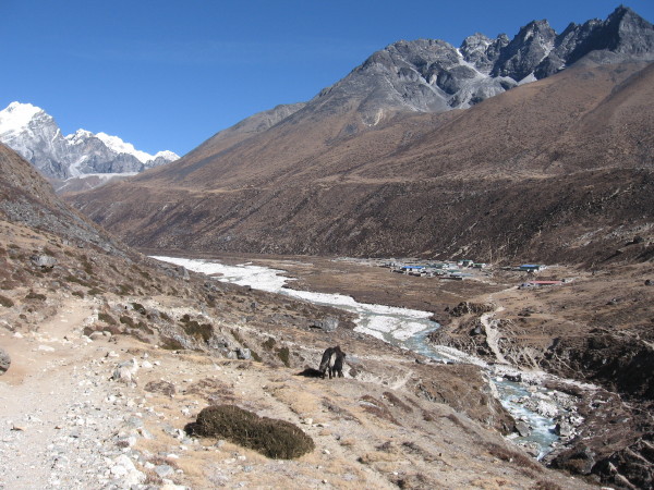 From Pheriche I headed up the long, mostly flat valley, to the last up climb to Dughla. At the Yak lodge there, had lunch. I spent most of the afternoon killing time reading and trying to stay warm.