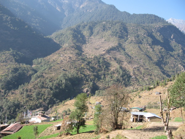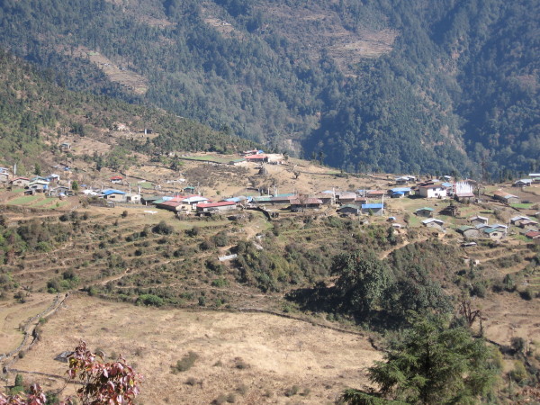 December 14, 2008 I left before Brad and Osa did. From Tharepati it was a steep descent of 3000 feet to Melamchigaon where I had lunch. Then I dropped another 1500 feet to the river and climbed 2000 feet up to Tarkeghyang where I stayed the night. The family that ran the lodge were very friendly and pleasant.