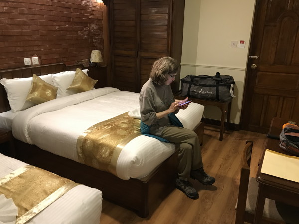 October 30, 2023 We arrived at the airport around 6 PM. Getting our visa and going through customs was very easy. We were met by the travel staff member who took us to our hotel, the Dom Himalaya near the Thamel tourist area. We shared a room for three on the 4th floor in a section of the hotel with no elevator. Taking the stairs was good training for our upcoming trek.