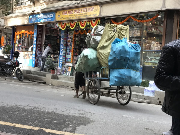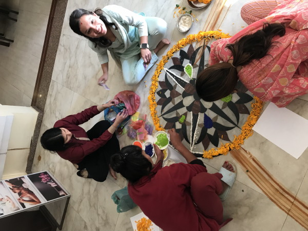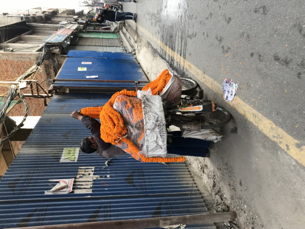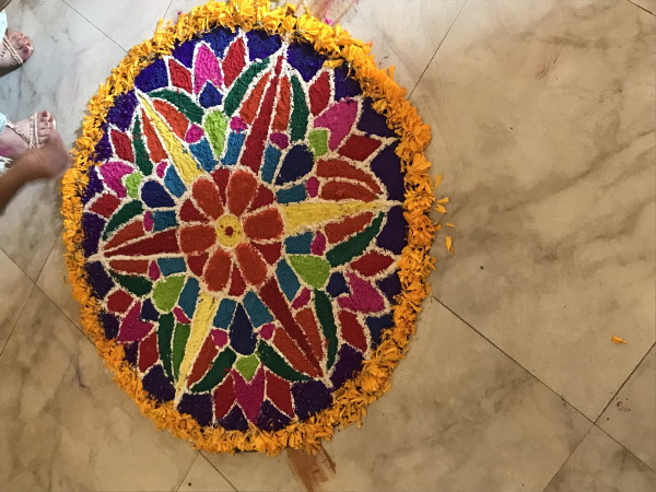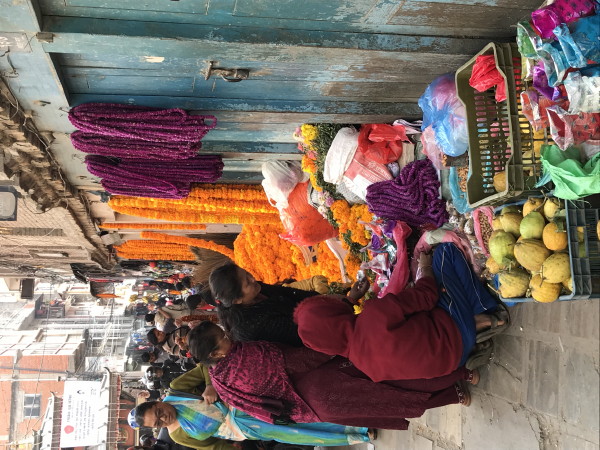 November 12, 2023 Our last day we watched people in the street as they celebrated the festival. While watching a cricket match on the hotel TV, we also observed the hotel staff decorating the floor with a display. That night we flew out of Kathmandu and home.