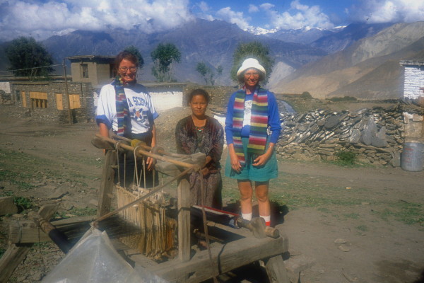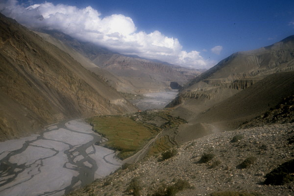 Oct 2, 1993 We joined Neila McCabe, a school teacher from Nova Scotia and her porter Sarish for the hike to Muktinath. As we gained altitude, the scenery became more rugged and open. We looked north to the restricted area of Mustang. At Muktinath we stayed in a marginal hotel with mud floors, but great food. Two Nepalese engineers told us of their years in Catholic school in Kathmandu.