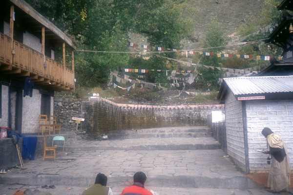 Oct 3, 1993 The sunrise on a clear day is very beautiful. Sarish, a Buddhist, took us to the Buddhist temple. The temple is built on top of a natural gas vein, which lights a flame underneath the alter. We walk back to Jomson, via Kagbeni. The last two hours were very windy and dusty.