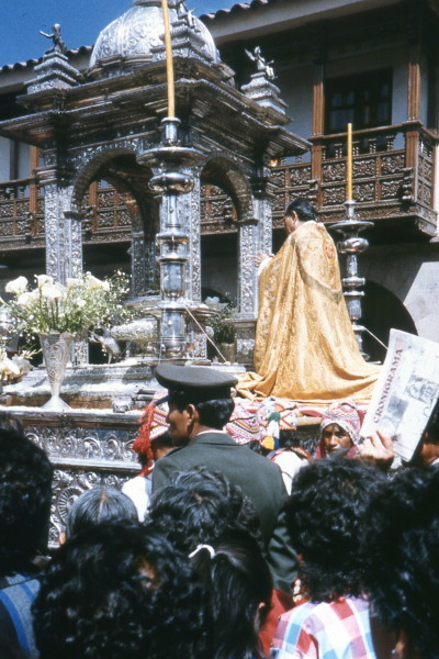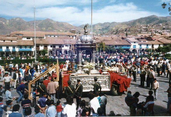 Thursday, June 2, 1988 Today is Corpus Christi day, a big festival day for Cuzco. At the 'postcard' cafe near our hotel, I had cheese and egg omelet plus pineapple juice for breakfast. The religious ceremonies were very slow and the crowds filled the Plaza de Armas. We did not stay for the whole thing. That night we had a dinner at a Japanese restaurant and later, at a rundown theatre, we saw the US movie, The Hitcher, for 42 Intis.