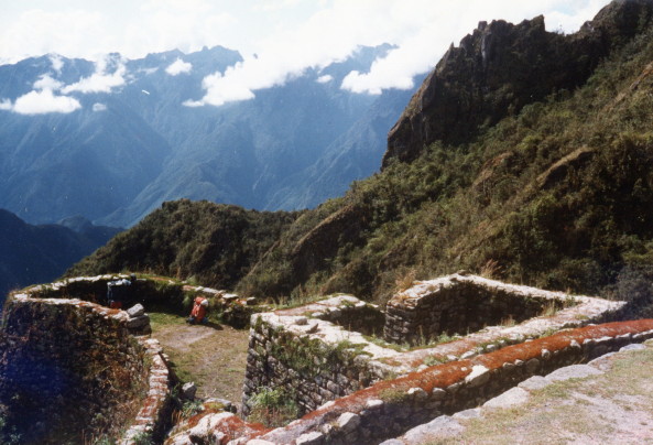 Wednesday, June 8, 1988 In the morning we had breakfast and waited for the sun to hit our tent. We left early morning and hiked to the third pass which overlooked the ruins of Puyupata-marca. We ate lunch at the ruins. Trying to find the Inca Trail at the bottom of the ruins, I fell headfirst off one of the terraces with my pack on.