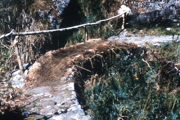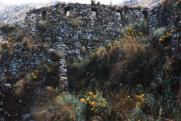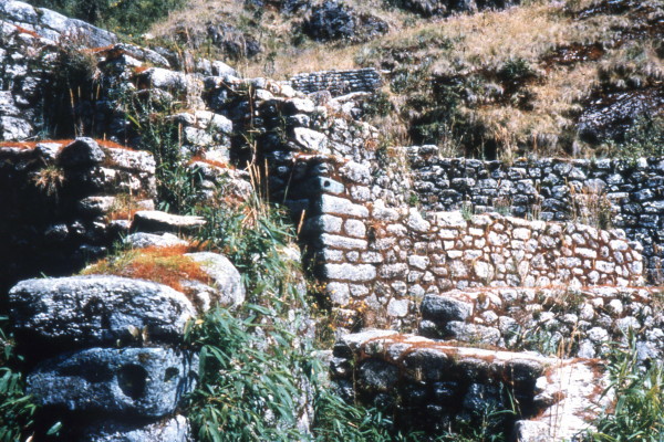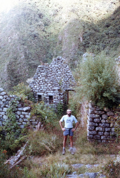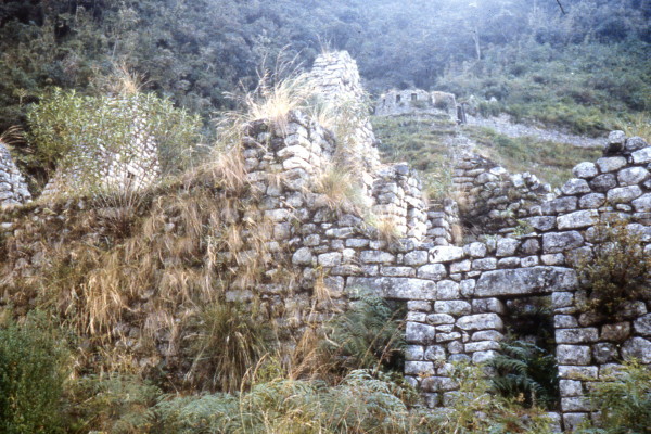 The trail to Huinay Huayna was very spectacular. The narrow stone road hugged the mountain cliffs and were surrounded by dense high jungle. The overgrown ruins at Huinay Huayna were well worth seeing. We camped next to a hotel that had been built near the latter ruins. I was pleased to find a barrel that I could dump the Inca Trail garbage in.