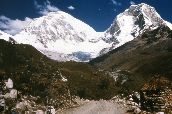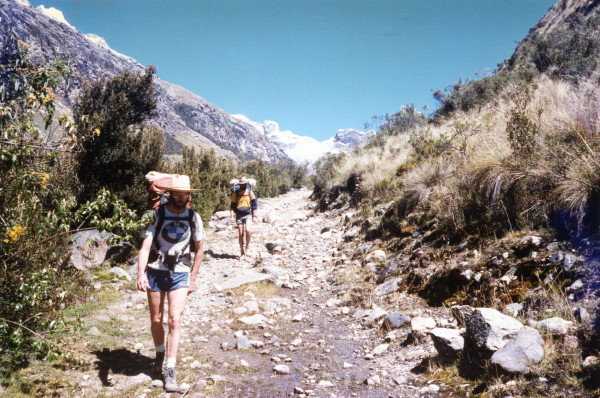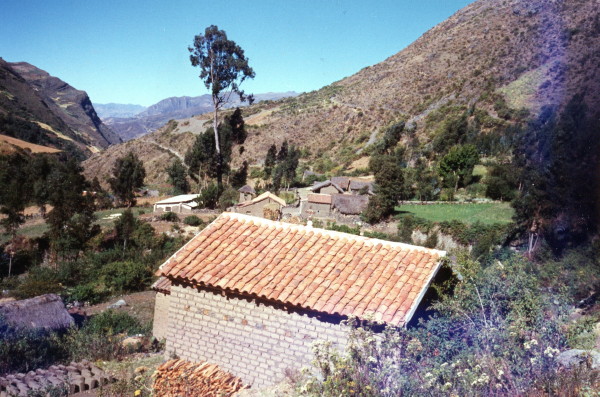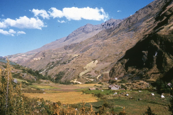 Wednesday, June 15, 1988 Our campsite offered some good early morning sunlight. Rick gave some bread to a guide who passed by with some mules. The trail led down the valley, following a stream, in the afternoon, we reached the village of Colcabamba, where we bought cokes and sugar (for cocoa) from Mrs. Calonge. She had lost her husband the previous year. We hiked up the next valley and camped in a boggy meadow next to a swift stream.