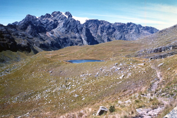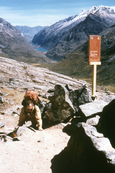 Friday, June 17, 1988 It was a long climb to get to Punta Union, but what a fantastic view once we got there! There we met a Peruvian, a mad Englishman, and porters and burros. Along the way down we met several other groups of hikers and climbers. For a campsite we found a nice spot in some small trees overlooking the marshy valley below. Rick tried to sleep out, but it was too cold. Water froze inside the tent.