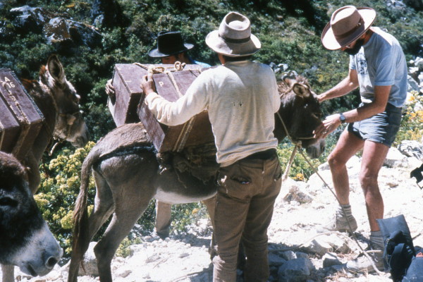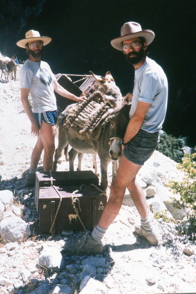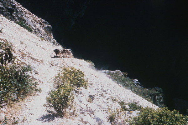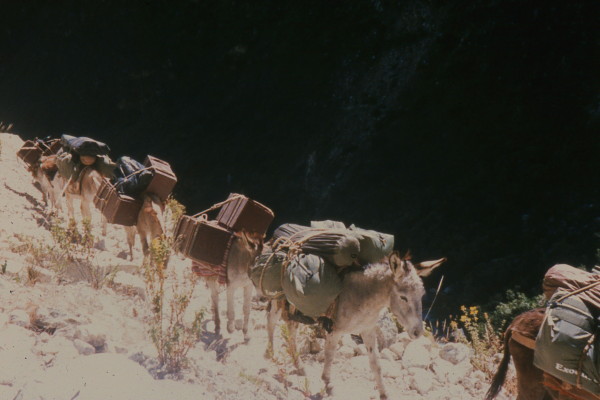 Sunday, June 19, 1988 We had breakfast of the last of our food, except for a few figs and nuts. The trail down was fairly steep in places. We came upon a group of burros coming toward us, so we waited for them to pass on the narrow trail. One burro fell to its knees and then slid down the steep shale slope toward the river below. We helped two guides get the burro back on its feet and up to the trail, one guide lifted and carried, in his bare feet, each of the two heavy boxes back to the trail. There they loaded the boxes again on the burro's back.