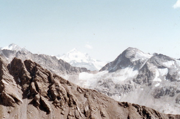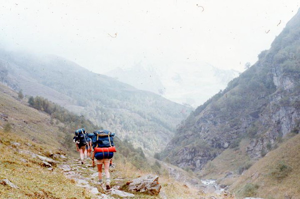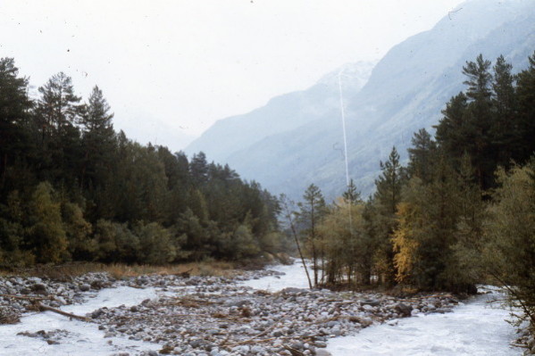 The trail then became very steep and followed a mountain upstream into the ravine. After about an hour we came upon a herd of cattle in an open meadow attended by a man on horseback. Later we saw sheep and the stone huts in which the herders lived. We camped in an open valley near the herders huts. Near our camp was an elaborate monument to three climbers who had been killed in an avalanche at the site. Our camp area was very messy with garbage from previous campers.