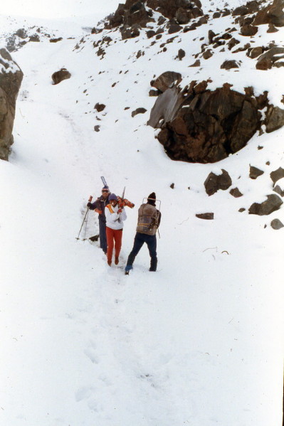 Sep 14, 1985 During the night, the storm had worsened. It was advised that everyone go down the mountain. All 20+ people packed up and hiked down the mountain to the trams. Visibility was poor and the snow was over a foot deep. Some of the Russian guides wore only tennis shoes on their feet. Most of the participants were very disappointed in the weather.