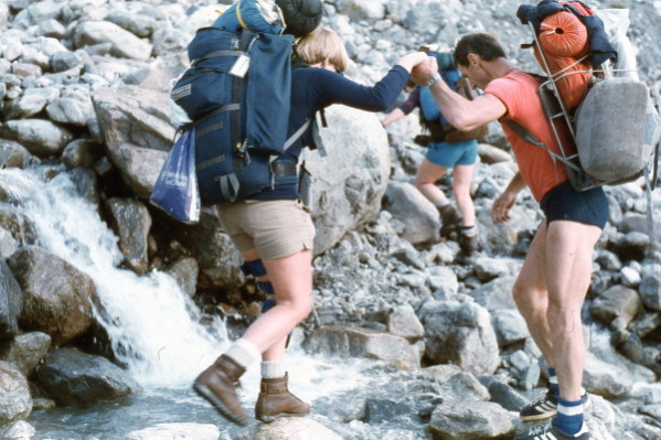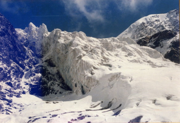 Taya fell into a small ice crevasse, but emerged unharmed. Snow covered many of the ice crevasses, so it was important to be very careful. A few times we held onto a rope as we crossed over a crevasse. The last few hundred feet to the top of the pass was very steep. I could hear my injured right knee crack with every step. In early summer I had badly torn my ACL in a soccer game.
