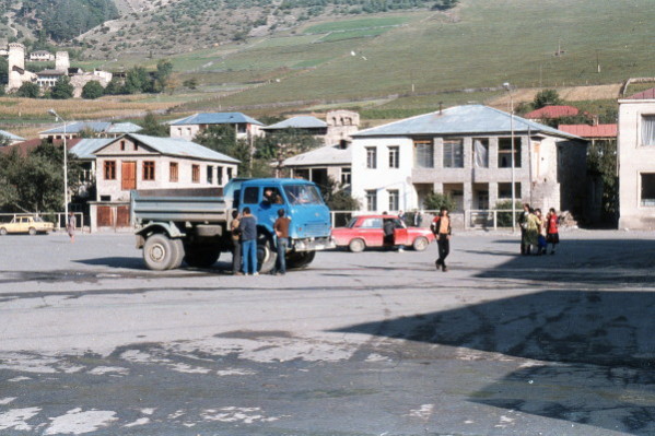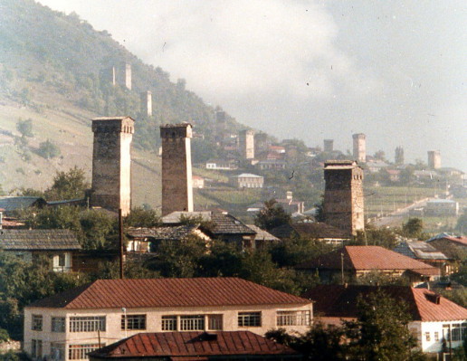 Late in the afternoon, Mike thumbed down a truck for a lift. We all climbed in the back of the truck and took off on a narrow mountain road toward Mestia. A pickup behind us soon sped past, with the passenger shooting a wild shot from his revolver over our heads, all in jest. The driver honked his horn at every opportunity. At one point he stopped a truck loaded with gasoline, so as to buy some gas off of them for his nearly empty truck. The ride took us past many spectacular sights, particularly of the many watch towers. At Mestia we checked into a YWCA.
