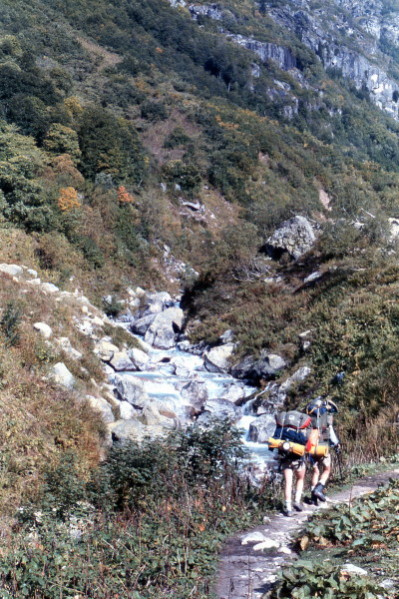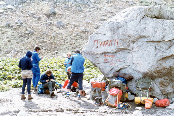 Sep 19, 1985 In the morning we ate a late breakfast, before departing at 9:00 AM. The day was sunny and warm as we headed toward Dongus-Orun Pass. After Becho Pass, I had thought a lot about Dongus-Orun and this day. I was nervous about another hike with significant exposure risk. At noon we stopped at the base of the pass and had a final hot camp meal. During the meal a cold front rolled in, complete with light snow.