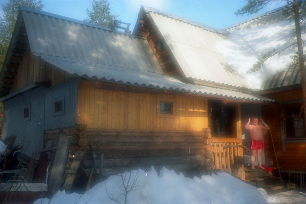 It was explained to me that many Russians have dachas in the country. Typically, they will leave their city apartments on Friday afternoon and spend most of the weekend building the dacha, adding on to the structure, working the greenhouse, and scheduling in long banya's, or saunas. Uncle Konstantin's dacha is surrounded by thick Karelian pine and birch woods, as well as by other dachas. In mid-winter, when the dachas are mostly empty, vandalism occurs occasionally.