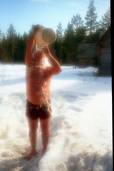 Periodically we took a break to drink tea or beer. To make the sauna hotter Uncle Konstantin would throw water, mixed with eucalyptus oil, on the stove. At times I would have to breath deeply to get enough air. After a while we jumped in the snow to cool off. Then back In the sauna. Afterwards, we had a dinner of fried chicken, raw bacon, fish, salad and soup, with many toasts of vodka.