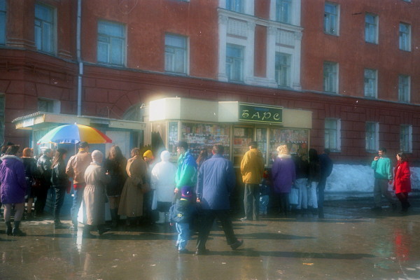 April 7, 1996 I met Joe at his room at the Northern Hotel. He had stayed with his host for one night, before moving into a hotel. We went to the Ben & Jerry's store. There was a long line of people waiting to buy ice cream. The pint containers being sold were imported from Vermont and were the same as what we buy in the US. The ice cream and waffle cones were made locally. Both were really excellent and at 50 cents (2500 rubles) for two dips in a waffle cone, a great deal.