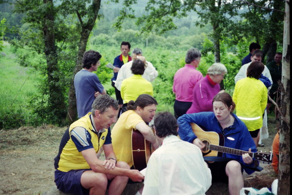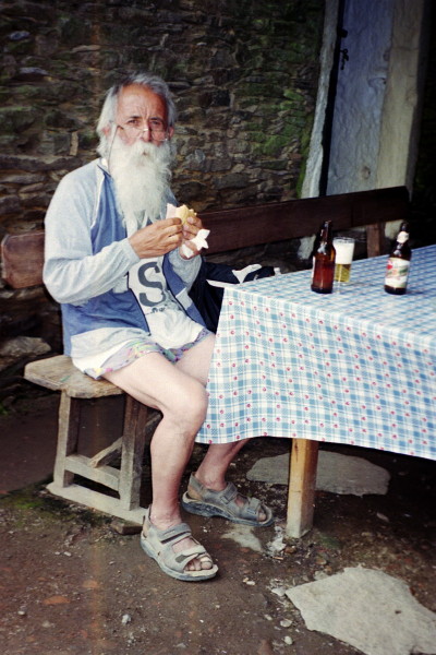 May 31, 2001 I left in the dark, about 6:00 AM. Soon an old Italian man, Luigi, caught up with me. He had started walking in Italy and was excited to have just 2 days left. He walked in sandals, having worn out his shoes. With his long white beard, staff, and lean frame he made quite an impression. When I first saw him, I thought he looked like Jesus or some biblical figure. Other pilgrims had nicknamed him Jesus .