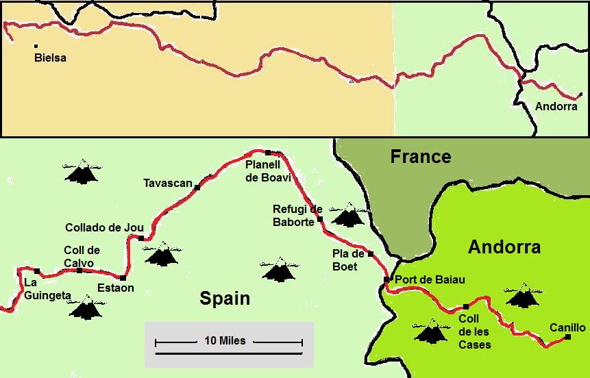 The bus to Carillo took me just a few miles up the road from Andorra. From Carillo I started my Pyrenees walk. I was following the description in my Lonely Planet Walking in Spain guide book and also had several Alpina maps. The path to the Coll d'Ordino was difficult to follow initially. Eventually the path became clear and I found the trail markers painted on rocks.