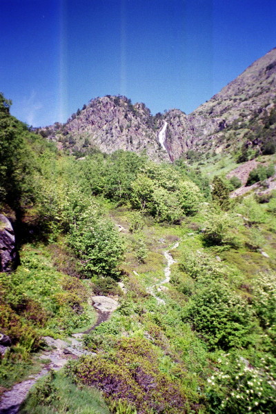 June 13, 2001 I walked downhill to the ski village of Arinsal. From there the trail led steadily up to the pass at Port de Belau at 9000 feet altitude. Along the way I saw several helicopters delivering supplies to a nearby refugio. The snow at the pass was soft and deep. Luckily none of it was very steep. Though the first few hundred yards down from the pass looked impossibly steep at first, it turned out not to be difficult. I lost the path a few times and eventually reached Pla de Boet, which had campsites.