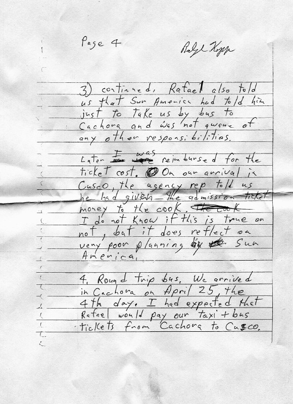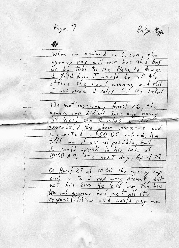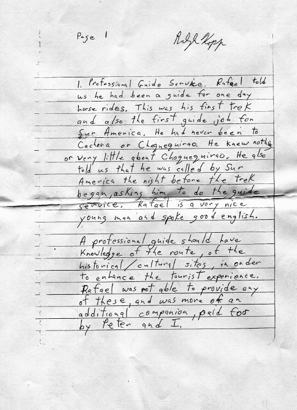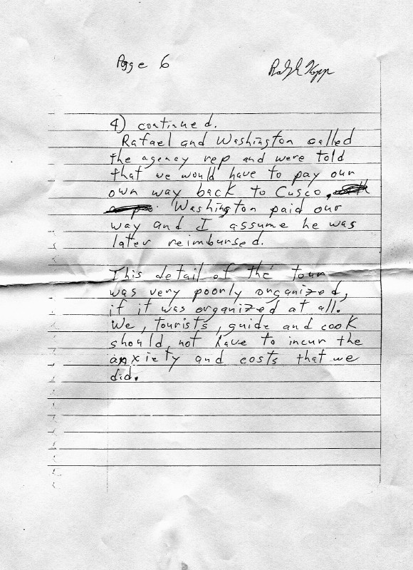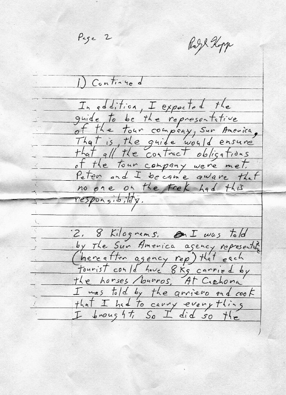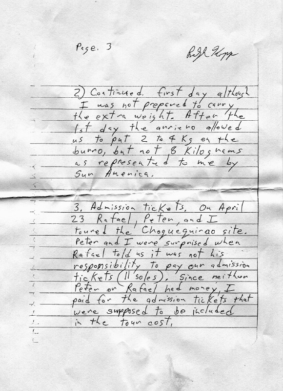 I was very upset about all the problems with the trek, which were the fault of the travel agency. I talked to them about a partial refund, but they were unwilling to consider it. I filed a complaint with the local tourist office, which got their attention. I never did hear how the complaint was resolved, and I did not receive any refund. But I am glad I filed the 10 page complaint below.