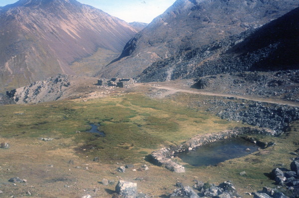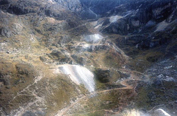 April 28, 1992 In the morning I walked with my pack to the Plaza Libano, where I found a 10 AM bus going to Ventilla, the start of the Tequesi Trail. I did not have a seat, instead I sat on bags, etc stacked 3 foot high in the aisle of the bus. At 12:30 PM I arrived at the village of Ventilla and started hiking. I took a wrong turn at one point, but got my bearings again. Stopped at 5 PM and camped at about 13,000 ft altitude. I shared the site, near the San Francisco mine, with 3 pigs.