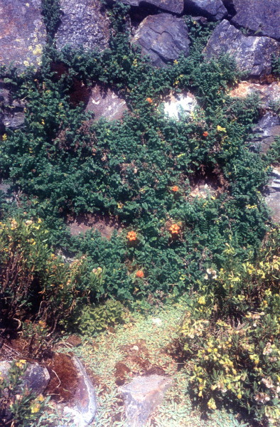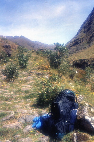 In the morning I hiked up to the pass, near 15,000 . There and beyond were many fine examples of stone Inca Trail. Many stretches were hundreds of meters long. Past the village of Tequesi, the vegetation became much more lush and green. For the last 3 hours I hiked along a high ridge, and camped almost on the trail, next to a loud river.