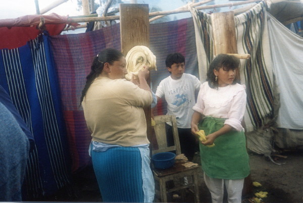 June 26, 1992 We took the 8 AM bus to Otavalo. Stayed at gringo place, Hotel Rocio. Watched a religous festival with lots of dancing. Saw an ongoing rock fight. We discovered the Shenandoah pie cafe on the market square. Great pies and ice cream. The Saturday market was outstanding. When we got back to Quito on Sunday, we watched 1 and 1/2 soccer games.