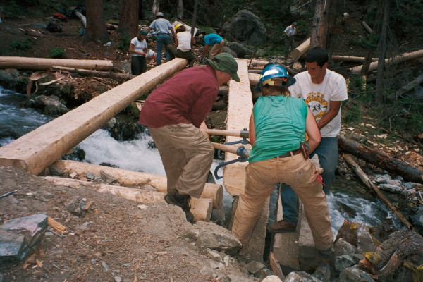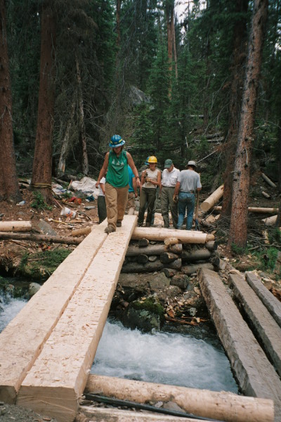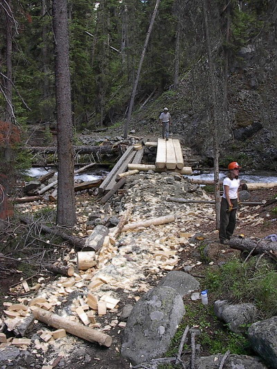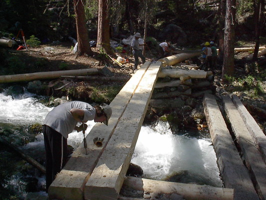 The volunteers helped to construct and place 3 stringers to the bridge. The Forest Service Trail Crew were to finish the project in 2-3 days.